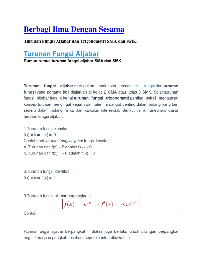 Assalamualaikum adik adik, kali ini kita akan membahas soal cara mencari. Matematika smaturunan fungsi aljabarsemoga bermanfaat. Carilah turunan pertama dari fungsi berikut: Turunan fungsi trigonometri yaitu proses matematis untuk menemukan turunan pada suatu fungsi trigonometri ataupun tingkat perubahan terkait dengan suatu variabelnya. Adapun turunan fungsi merupakan fungsi lain dari fungsi yang diketahui.